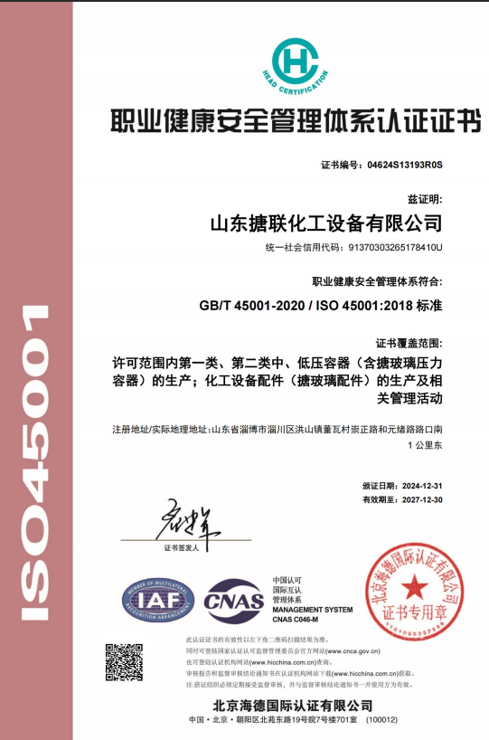 职业健康安全管理体系认证证书_荣誉资质_反应釜厂家